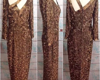Vtg 80s 90s Asymmetrical Stephen Yearick Copper Beaded Dress Prom Formal Evening Gown Size 12 Womens Vintage 1980s 1990s