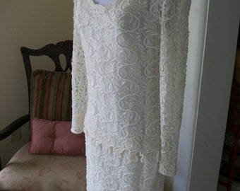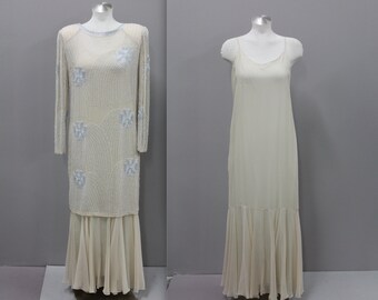 Oleg Cassini Two Piece beaded Ivory Gown, Vintage Gown, 2Piece Layered Dress Set, Beaded White and Off White Set, Blue Floral Beading Set,