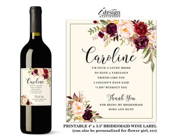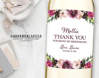 Thank You For Being My Bridesmaid Gift Wine Labels | Diy Printable Floral Boho Watercolor Flowers Bridal Party Thank Yous Wine Bottle Label