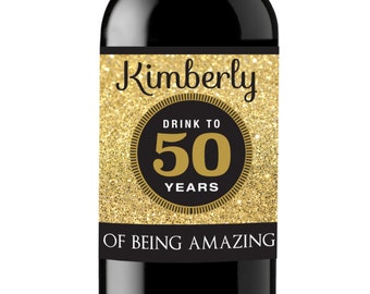 Custom Happy Birthday Wine Labels - Gold Sparkle Personalized Birthday Gift - WEATHERPROOF and REMOVABLE - Wine Bottle Labels