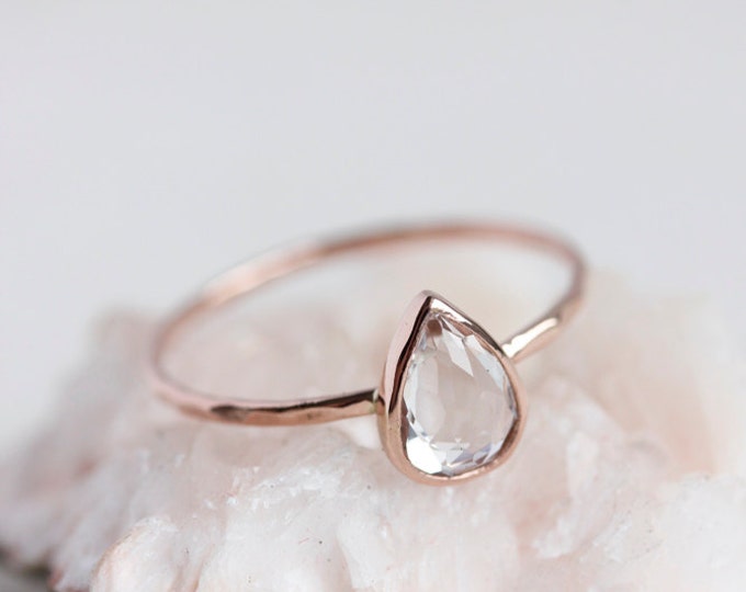 White topaz pear cut engagement ring, rose gold, yellow gold, white gold, teardrop, delicate, eco friendly