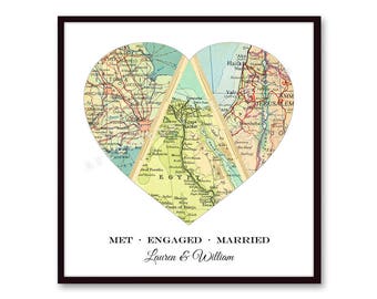 Unique Wedding Gift for Couple, Engagement, Personalized Map Heart Art, Anniversary Gift Bridal Shower Gift, Met Engaged Married 3 Map Heart