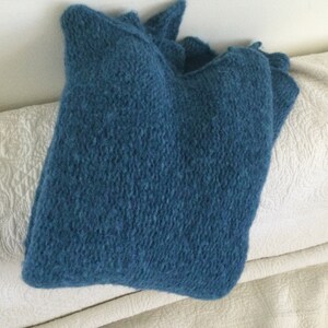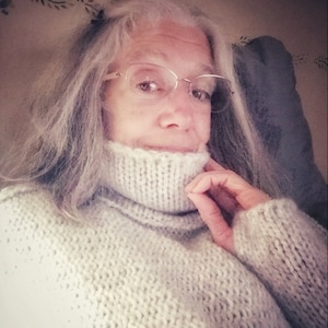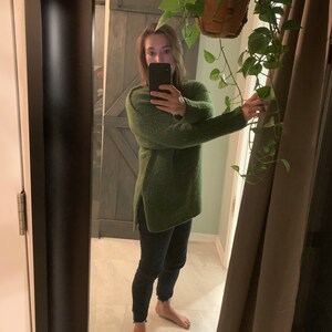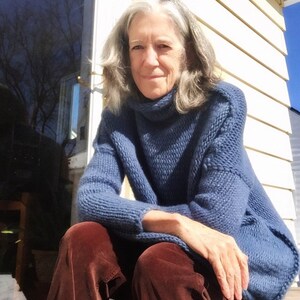I love this cozy, oversize sweater. Can't wait to wrap myself up in it on a cold winter night. The colors are soft and the neck comes up high so you can cover your face if cold. Homemade and wonderful and a reasonable price.