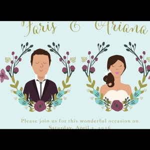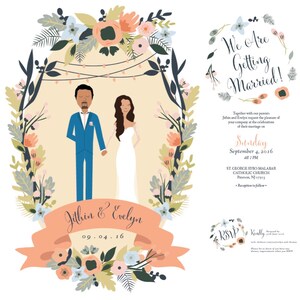 You can edit any and all of the content. This means that you can write anything you would like on your invites and RSVPs. Also we will be illustrating the couple to look like you and your partner. If you would like to edit the background or add a pet or additional family member, please convo us so we can quote you and set up a custom listing.