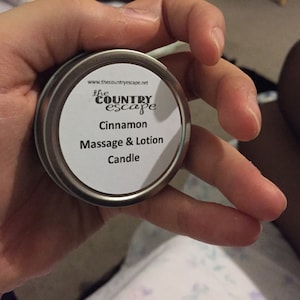 You are purchasing one of our Relaxing Massage and Lotion Candles used for massage therapy and moisture replenishment of dry tired skin and muscles. Simply light the candle and let burn for a few minutes until a small pool of melted wax forms. The candle is designed to melt at low temperature so it does not burn the skin. Pour a small amount of melted wax in to hand and massage into you back, cuticles, elbows or any dry or sore areas. Our massage candles are all natural and do not contain any artificial ingredients or dyes, just great oils, and butters all designed to moisturize and soothe your skin.