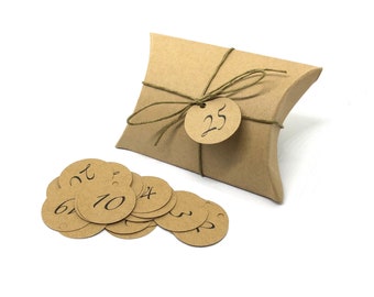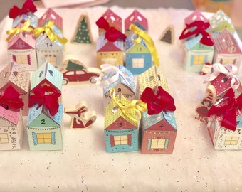 There are 24 cute cottages/paper boxes for a gift each day. You can fill them with chocolates or small gifts.