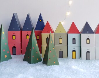 Advent calendar printable, Christmas Village, 24 cute Advent favor boxes for Christmas countdown, 3 Christmas trees - xmas calendar gift box