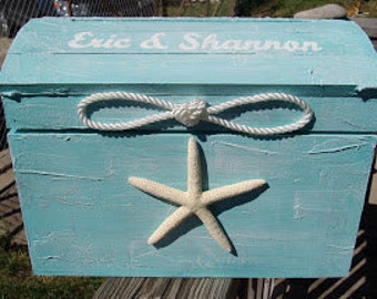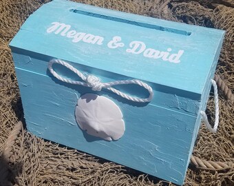 Personalized Aqua Nautical Themed Beach Wedding Card Box Treasure Chest Unity Rope White Starfish Sand Dollar Accent Birthday Money Holder
