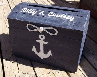 Personalized Navy Blue Whitewash Nautical Themed Beach Wedding Card Box Holder Treasure Chest Unity Sailors Rope Handles Hand Painted Anchor