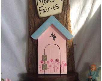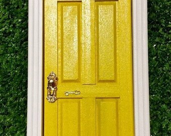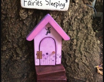 This Fairy door measures 7 1/4 inches at its highest point and 5 1/4 at its widest. It's been cut and sanded by hand. I have painted this one in a couple of my favorite shades of pinks and then the roof a greenish/blue bringing a little bit of that color down around the edges, then lightly distressed it. Then I attach 2 hinges (for extra strength) A glass bead is used for the door knob and a saw tooth hook is then attached for easy instillation.