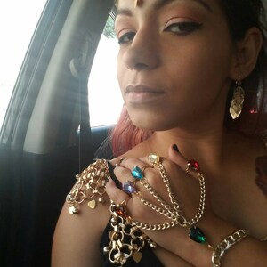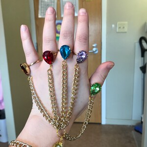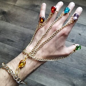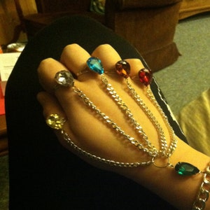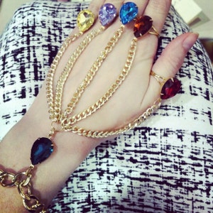 Ring adorned with gems attached to a the center gems by lightweight chain. Finished with a connection to a final bracelet chain completing the piece.