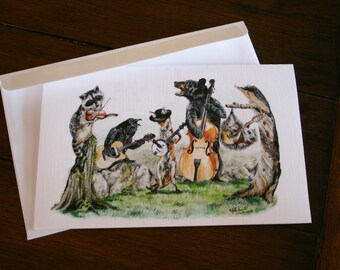 Bluegrass Gang music fine art card. Forest animal raccoon, opossum, bear, red fox, crow bird wildlife forest funny blank card.