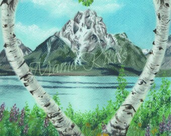 Love anniversary or engagement gift, Chalk Pastel fine art print illustration of The Grand Teton Mountains framed with heart aspens. -
