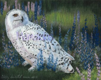 Snow in Spring , snowy owl in lupine flowers pastel painting by Holly Simental
