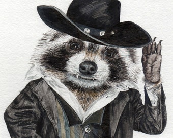 Raccoon Bandit , western raccoon in clothes animal painting by Holly Simental