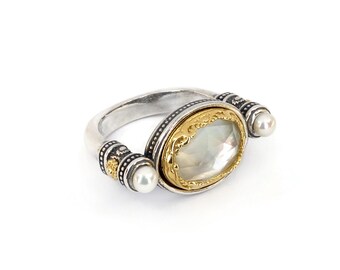 Beautiful silver gold and white pearl ring-925 silver and 18k gold pearl ring- Pearl solitaire ring-Classic pearl ring for women-Greek art