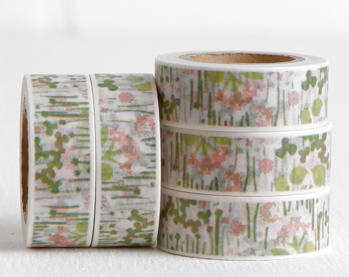 Meadow Flowers, Grasses, and Clover Washi Tape, Marsh Estuary Wetlands Pink Flowers Green Flora 15mm