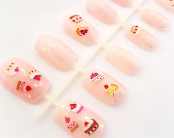 Cakes and flakes pink kawaii deco nails, cute false nail set