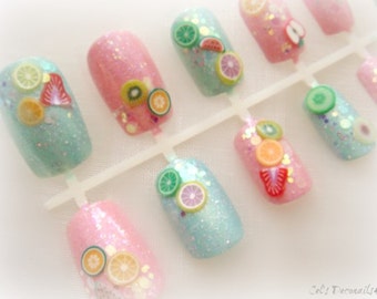Sweet pastel fruit nails, Japanese nail art set, kawaii 3d nails, pastel goth press on nails
