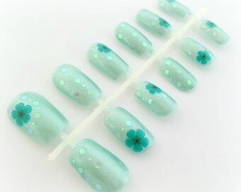 Spring flowers nail art set, handpainted nails, glitter false nail set