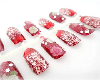 Red rose garden nails, hand painted glitter nails, gift for her, women accessories