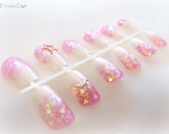 Holographic pink glitter Japanese style handpainted nails, women accessories