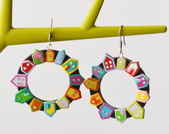 Colorful house clay earrings Statement earrings Big round earrings Valentines day gift Christmas gift Girlfriend present Best gift for her