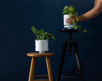 Choose to purchase just the Oak hook with the macrame sling, designed to fit any shape and size planter you like, or purchase both the plant hanger and our matching self watering planter . Our aluminum planter includes a pot and saucer. All excess water is kept separate from your plant so it won't die from overwatering (the number one reason for houseplants dying!). Eventually the excess water will go back into your plant, using a self watering mechanism.