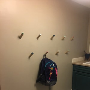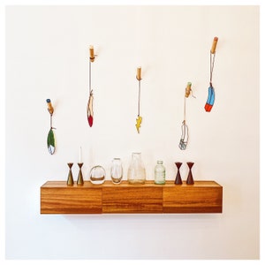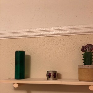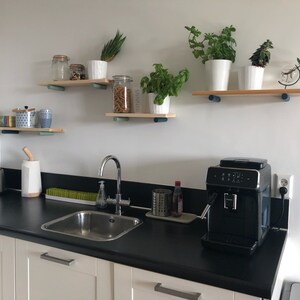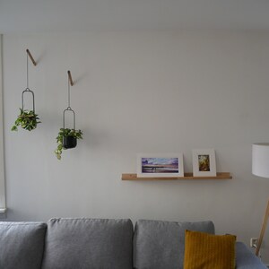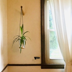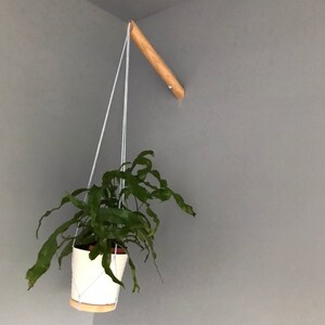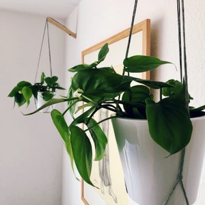 The Plant Hanger is made up of a wooden hook that attaches to your wall (screws + anchors are provided). A grove in the hook allows the thread to run through making it strong and allowing you to adjust the height of your planter.