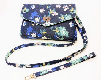 Small Dark Blue Denim and Floral Print Crossbody/Wristlet/Cellphone Pocket