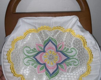 NEW VINTAGE 1970’S Hand Embroidered White Floral Handbag Wooden Handles