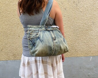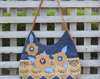 Denim Handbag, Denim Shoulder Bag, Denim Bag without Zipper, Boho Bag, Hobo Hippie Handbag