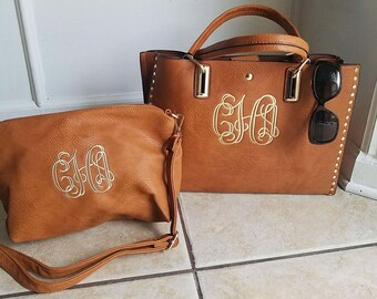 Personalized Purse, monogram tassel studded handbag in Camel