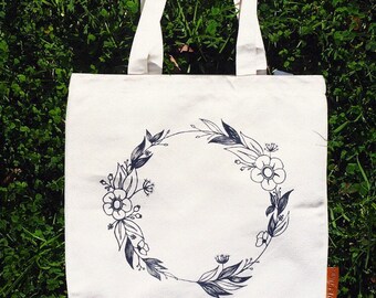 Flower Wreath 100% cotton, 12oz natural canvas tote bag. Ideal for a market bag, handbag, beach bag, shopping bag, grocery bag, library bag