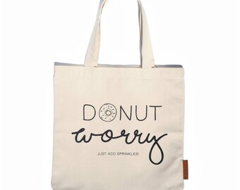 Donut worry 100% cotton, 12oz natural canvas tote bag. Ideal for a market bag, handbag, beach bag, shopping bag, grocery bag, library bag