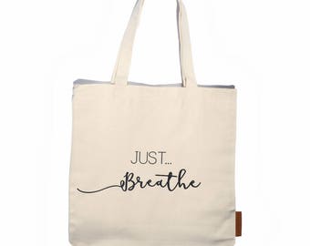 Just breathe 100% cotton, 12oz natural canvas tote bag. Ideal for a market bag, handbag, beach bag, shopping bag, grocery bag, library bag