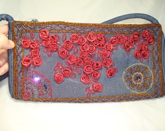 1998 Denim Handbag Beaded with Red, Gold and Copper Seed Beads with Ruby Red Satin Ribbon Roses.
