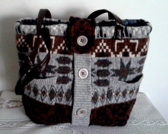 Bag made from a felted wool jacket, shoulder, lined with zipped pocket, closed with flap and button