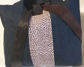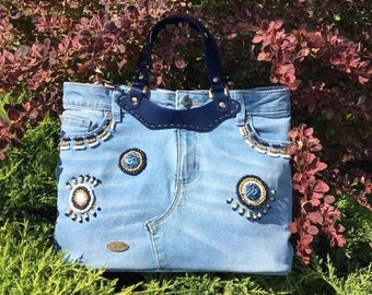 Handmade Blue Denim Handbag - Tote Bag - top handle bag with selected embellishments - beads for women with leather straps