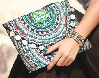 Ethnic Embroidered Clutch Bag with Silver Coins- Ready To Ship