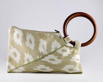 Handmade ikat wooden handle clutch, Beige Fabric, Women handbag, Mallorca fabric, Marblau Designs exclusive, Gift for her