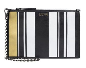 lightweight leather statement bag, crossbody clutch, hand painted stripes, black, white & gold, edgy glam, easy to wear | LINEAR bag