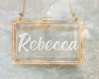 Clear Box Clutch - Personalized Name - Acrylic Clutch - Custom Vinyl Decal - Bridal Bridesmaid Gift