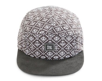 Premium handmade 5 panel hat - Customized aztec prints, real leather patch and strap.