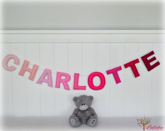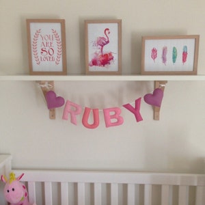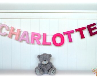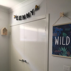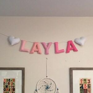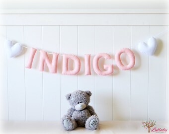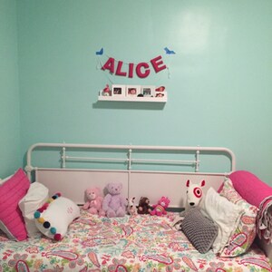 A perfect addition to your child's bedroom custom made to match their bedroom color and theme! Letter and embellishment sizing is approximately 5x5". Length of ribbon will be arranged after sale is completed. Each letter is hand cut from eco friendly felt, hand stitched with quality embroidery thread and stuffed with hobby fill to create a cute plump effect.