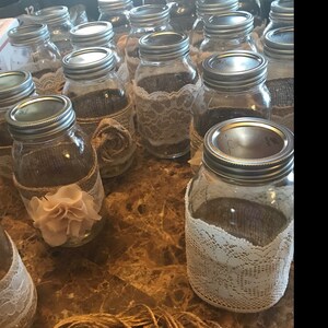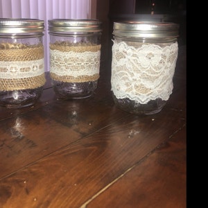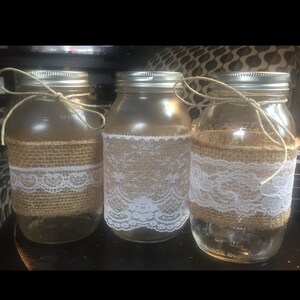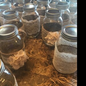Please note that mason jars are NOT included. This is to save you on shipping charges. Fits regular mouth quart size mason jars. I do have other sizes of Ball mason jars. Comes with twine to tie on your jars. Some lace may be different but will be substituted with similar lace of the same size.