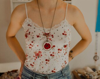 Hand Embroidered Poppy Mini Hoop Necklace