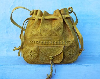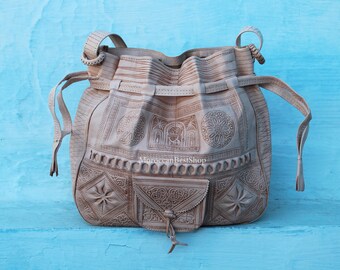 Large Engraved Handmade Moroccan Leather Bag, Boho Bags, Womens Leather Handbag, Large Bucket Bag, Festival Bags