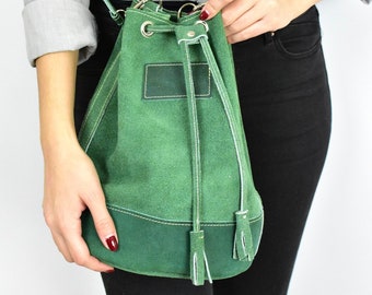 Large Bucket Bag, Leather Bucket Bag, Leather Drawstring, Leather Bag, Leather Crossbody, Suede Leather, Green Leather, Bucket Leather