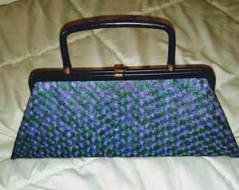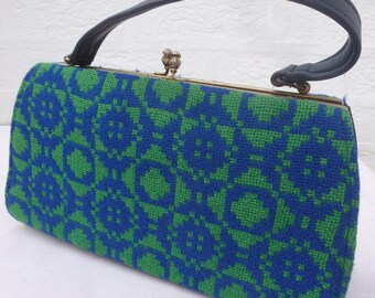Blue & Green handbag, vintage welsh tapestry wool bag with Top handle blue. 1970s festival womens heritage,for her vintage green accessory.